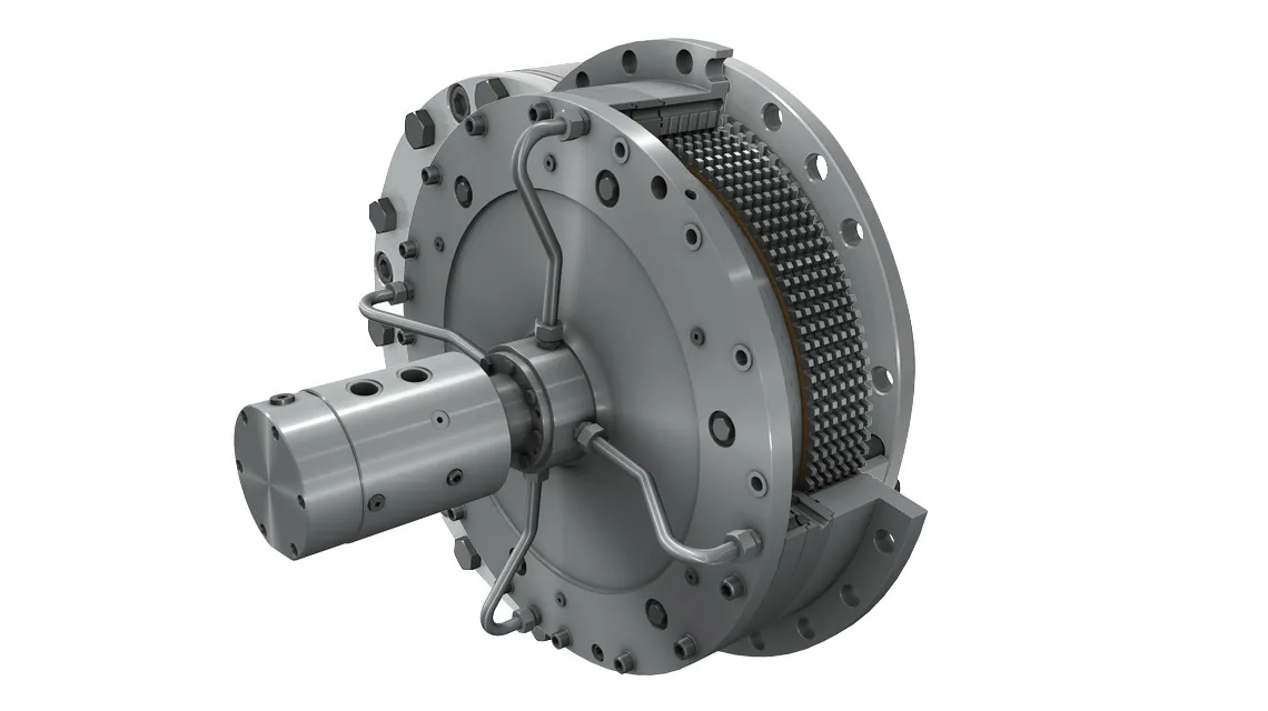 Hydraulically actuated clutches and brakes work exclusively with “wet-running” oil-cooled plates with the friction pairing steel/sintered lining. The advantages of actuation with pressure oil at 80 bar, the multi-plate construction type and the oil-cooled friction pairing steel/high-performance sinter result in an exceptionally compact design with high performance. They feature high torques, low mass moments of inertia, high switch times and little maintenance. The separate design requires different shaft ends for installation, which makes it possible to use different clutch and brake sizes. Since they run in a sealed housing, no dirt is released into the environment.